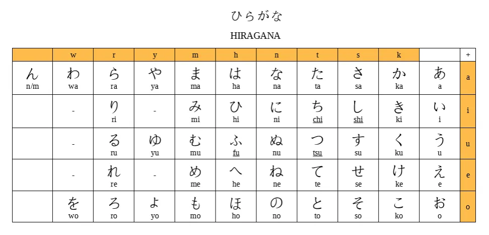 Hiragana to pierwszy system, od którego zwykle zaczyna się nauka japońskiego od podstaw. Składa się z 46 podstawowych znaków, reprezentujących sylaby. Jest używana do zapisu rdzennie japońskich słów, końcówek gramatycznych i partykuł.